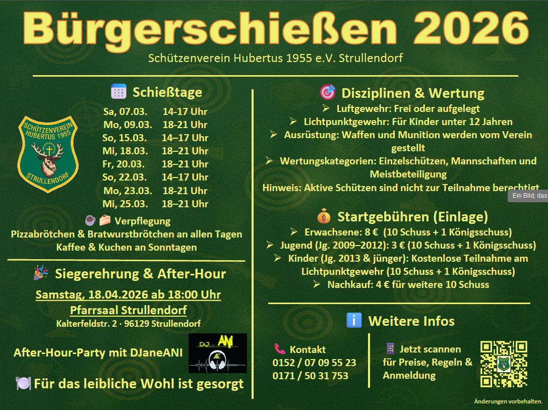 | Es dürfen keine aktiven Schützen (Schützenverein) teilnehmen. Änderungen des Schießprogramms vorbehalten. Der Teilnehmer ist damit einverstanden, dass der Name, die Ergebnisse oder evtl. ein Foto veröffentlicht (Zeitung/Internet) wird | Um Wartezeiten zu vermeiden, bitte Termine für Mannschaften ausmachen! Bei Fragen oder Anmeldung: 0152/07 09 55 23 oder 0171/50 31 753 |